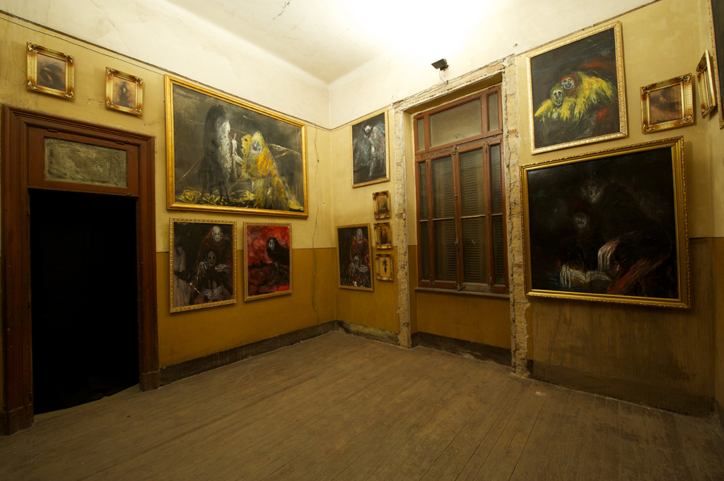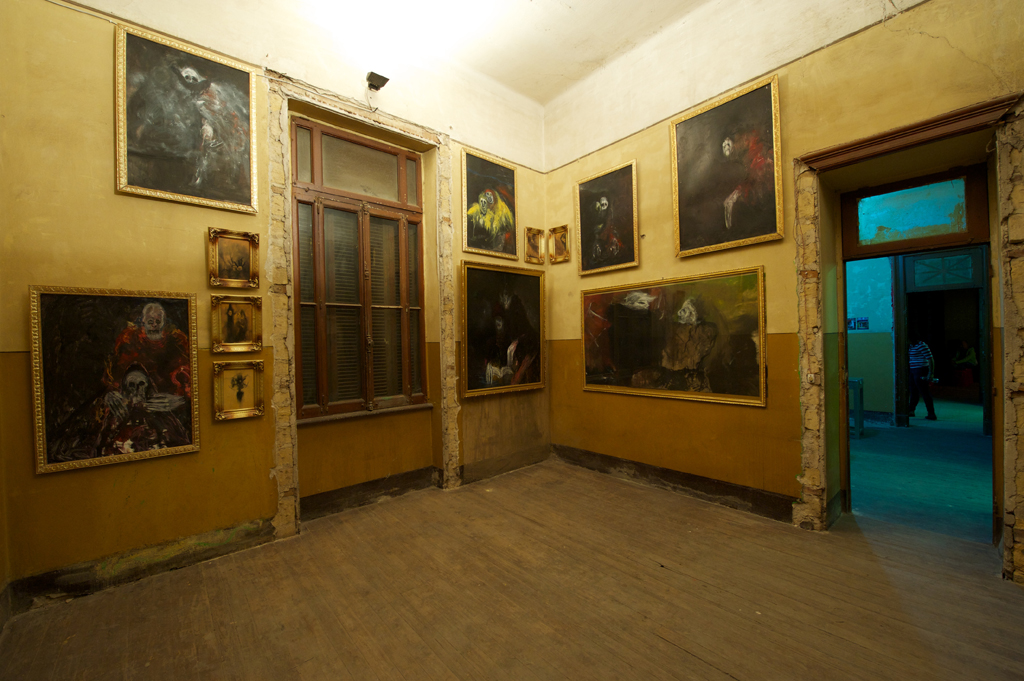 Devant la profusion des peintures de Ahmed Nosseir, Isabelle et Anne ont fait le choix d’encadrer les tableaux avec des baguettes dorées. Elles ont ensuite réalisé un accrochage extrêmement dense de ses tableaux, en disposition décalée sur plusieurs rangs.