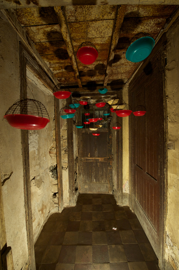 Des cages d’oiseaux sont installées dans un passage sombre qui mène à une porte définitivement fermée. Contre la vitre à barreaux du haut de la porte, un oiseau en plastique bat des ailes.