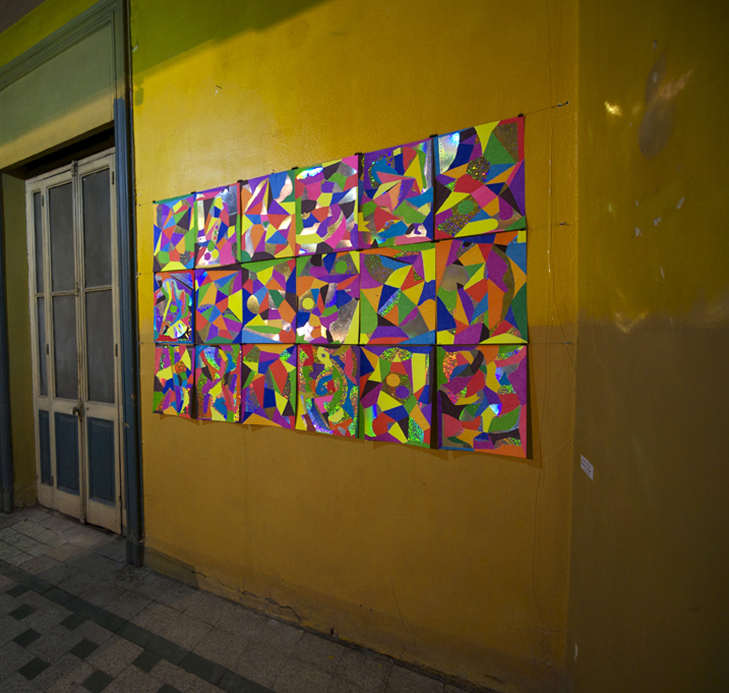 18 A4 panels using texta coulours and collages of hologram papers. I love using material that are seen as “popular” or even vulgar as the hologram papers. They are often seen in the streets of Cairo on the local vendors stalls or in decorarion for taxis and trucks. In this way the work reflects the visual sensations of walking around Cairo and the corresponding noises one can hear constantly. Shrill, harsh, sweet, bright, dark, loud, a cacophony of sounds of many colours which have no order or intention of harmony, creating a multicoloured and energetic background to one’s life Cairo. It can be done with any numbers of panels and set in any order…