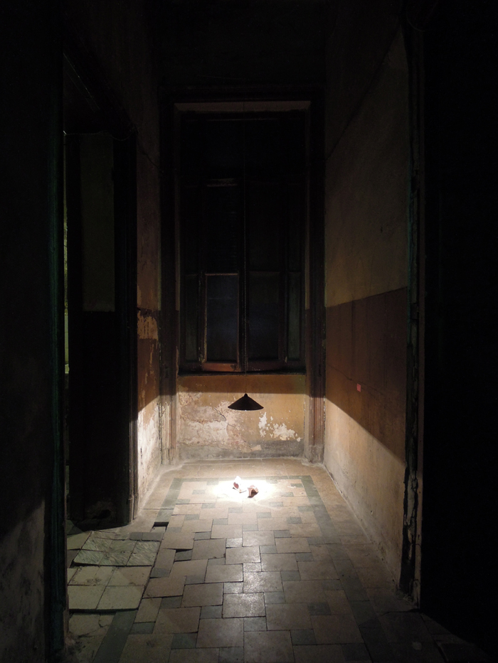 Sa présentation à même le sol est théâtralisée par un éclairage en douche.