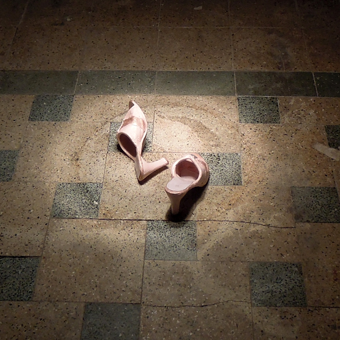 Reproduction en céramique d’une paire de mules à l’échelle 1/1.