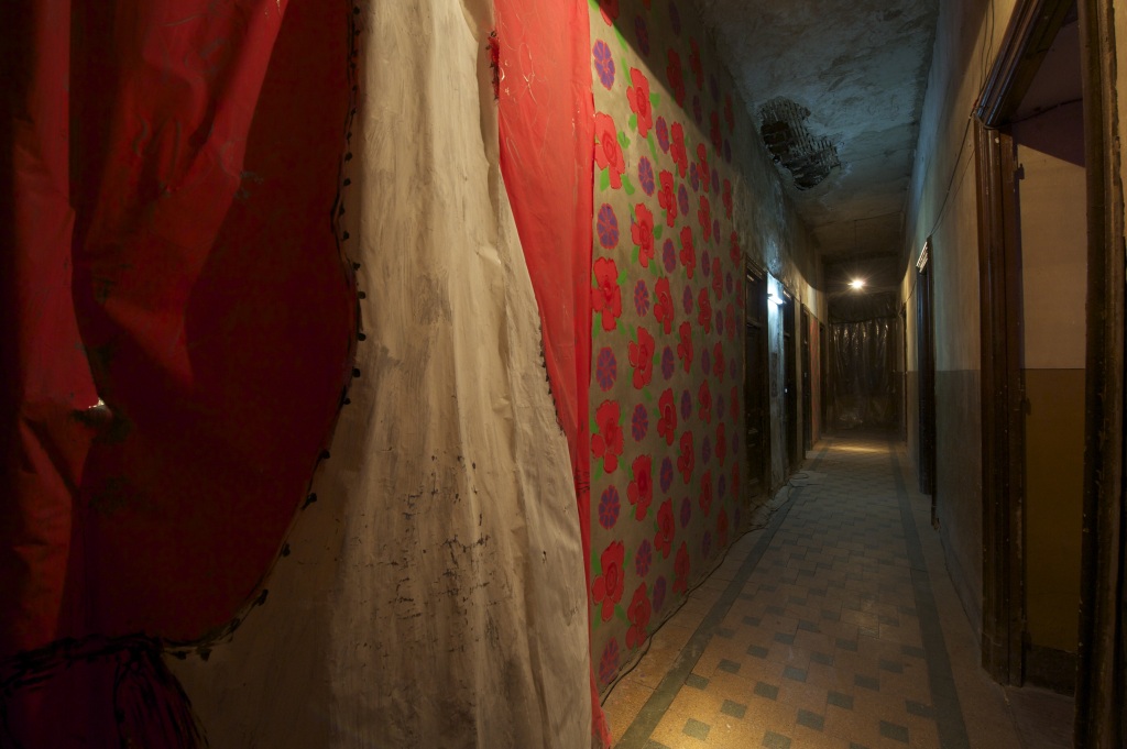 Dans le corridor de l’appartement, Anne peint une partie du mur dans le style des années 70. Sur la bâche devant la fenêtre c’est un voilage et un rideau rouge assorti aux couleurs des grosses fleurs du mur peint. Seule une partie de ce mur est peint donnant bien le sentiment d’inachevé, montrant ainsi que dans tout immobilisme rien n’est jamais fini.