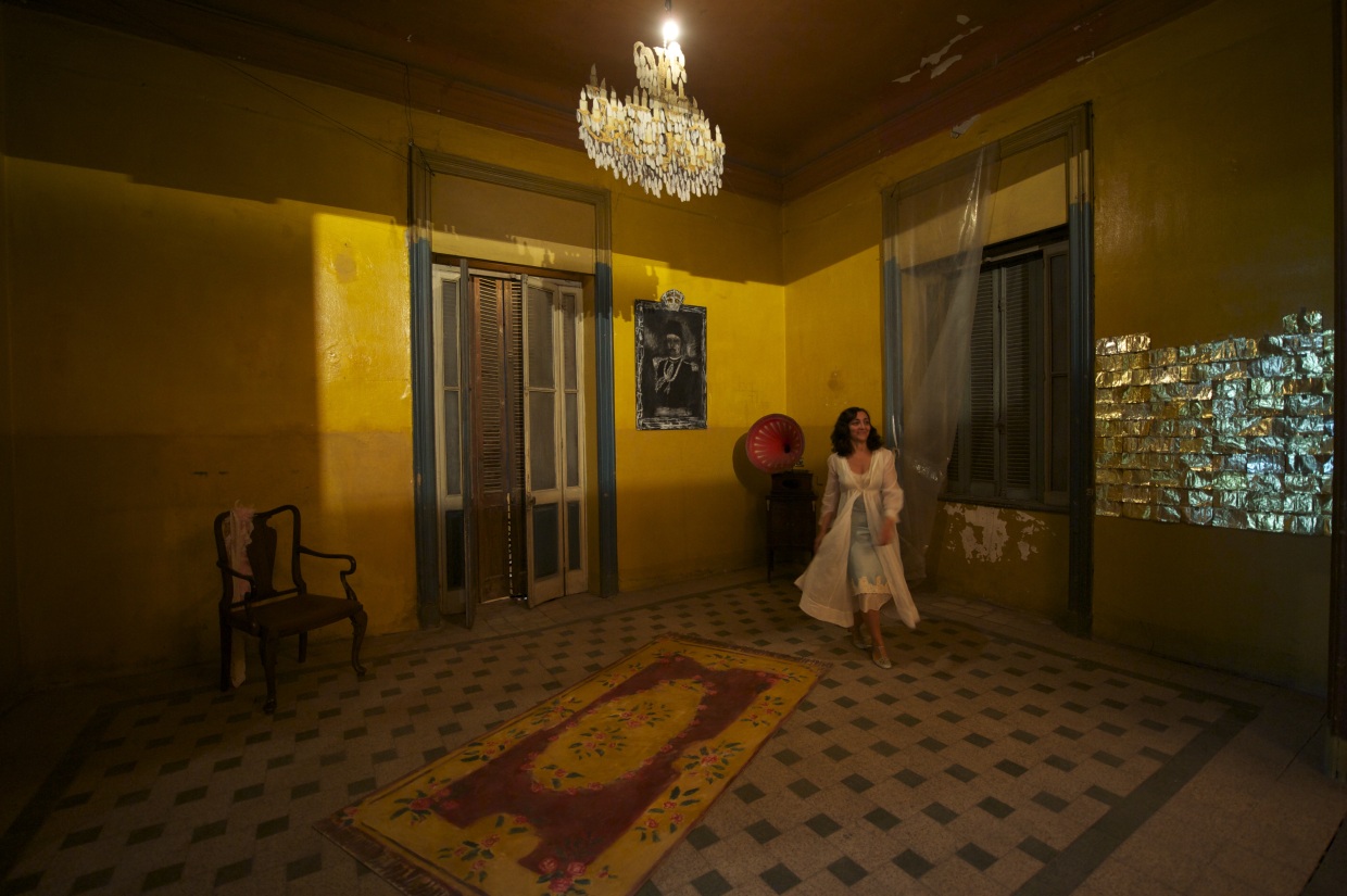 In here piece “Nostalgia”, Fatiha draws on her love of Cairo’s “belle époque” architecture and recreates an atmosphere that may have existed in this apartment during that era. She moves in a living-room furnished with a few vintage pieces including a working gramophone and contemporary pop-ups designed by artist Anne du Boistesselin. The audience finds her as she’s expecting her beloved with uncertainty, impatience, and excitement. She turns on the gramophone, and dances to express this range of emotions while she anticipates the arrival of her beloved. On the last two nights of the event, she improvised with the rapp band playing on the opposite part of the living-room, on remixed pieces by legend Mohamed Abdel Wahab.