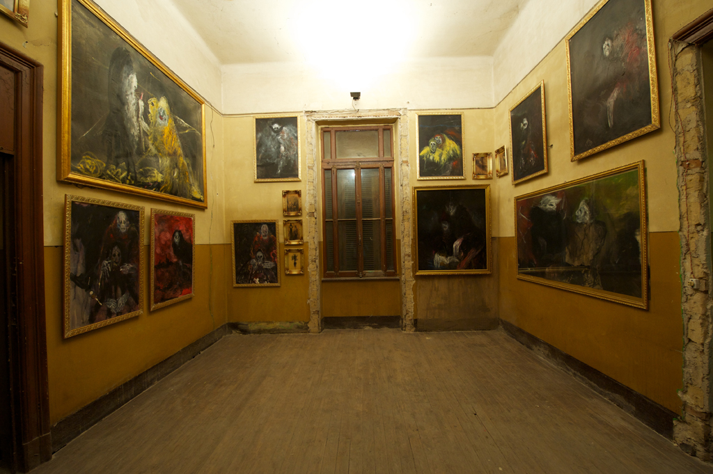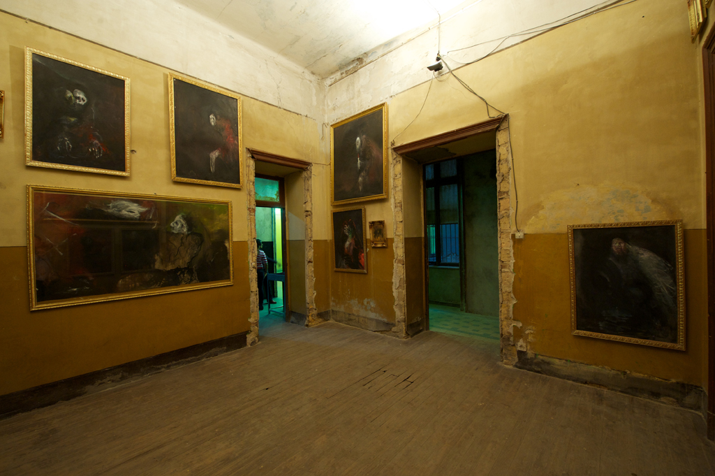 Devant la profusion des peintures de Ahmed Nosseir, Isabelle et Anne ont fait le choix d’encadrer les tableaux avec des baguettes dorées. Elles ont ensuite réalisé un accrochage extrêmement dense de ses tableaux, en disposition décalée sur plusieurs rangs.