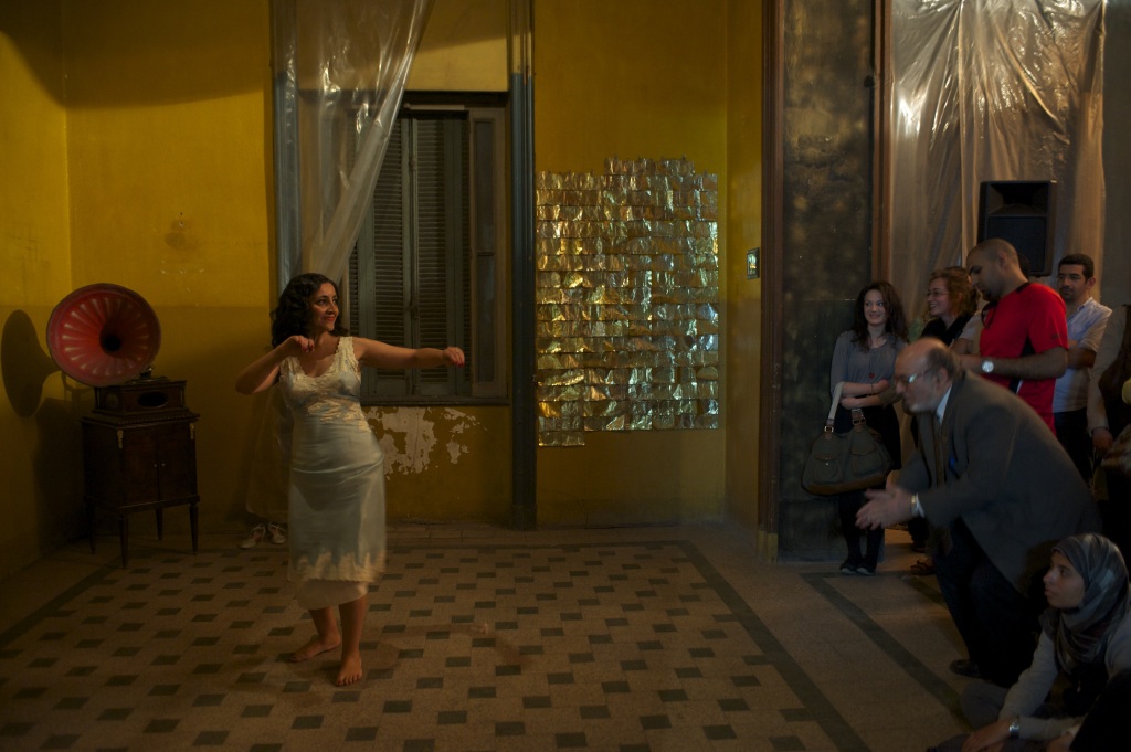 In here piece “Nostalgia”, Fatiha draws on her love of Cairo’s “belle époque” architecture and recreates an atmosphere that may have existed in this apartment during that era. She moves in a living-room furnished with a few vintage pieces including a working gramophone and contemporary pop-ups designed by artist Anne du Boistesselin. The audience finds her as she’s expecting her beloved with uncertainty, impatience, and excitement. She turns on the gramophone, and dances to express this range of emotions while she anticipates the arrival of her beloved. On the last two nights of the event, she improvised with the rapp band playing on the opposite part of the living-room, on remixed pieces by legend Mohamed Abdel Wahab.