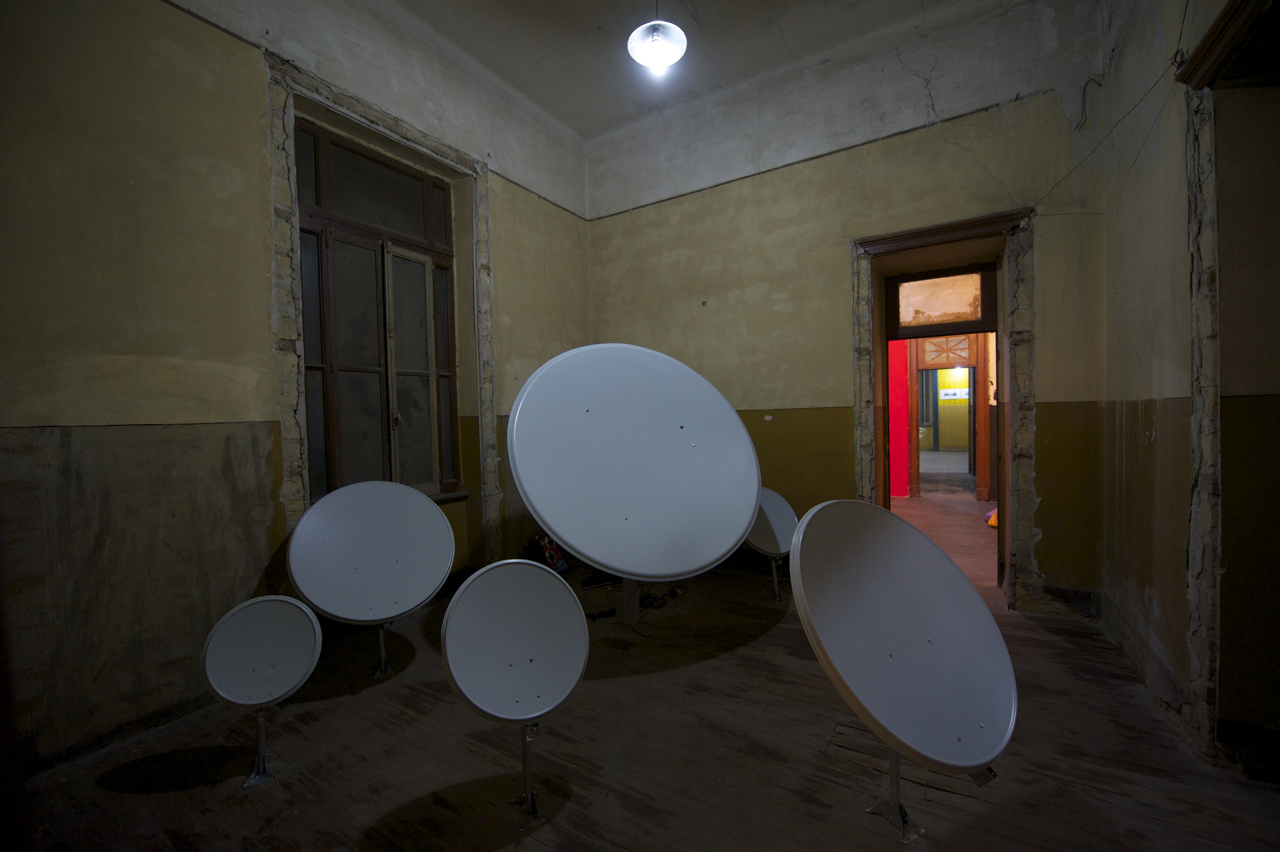 En détournant l’usage habituel de ces objets, ces paraboles servent de cymbales à la musicienne Béatrice Graf qui produit des performances sonores lors des ouvertures publiques. Ces cymbales sont reliées à un amplificateur Low-tech: le radio-cassette, objet populaire encore très largement utilisé au Caire. En transférant l’emplacement usuel des antennes paraboliques de l’espace extérieur vers l’espace privé (intérieur/foyer), ces récepteurs ne captent ainsi plus les satellites mais émettent un son directement engendré par la main.