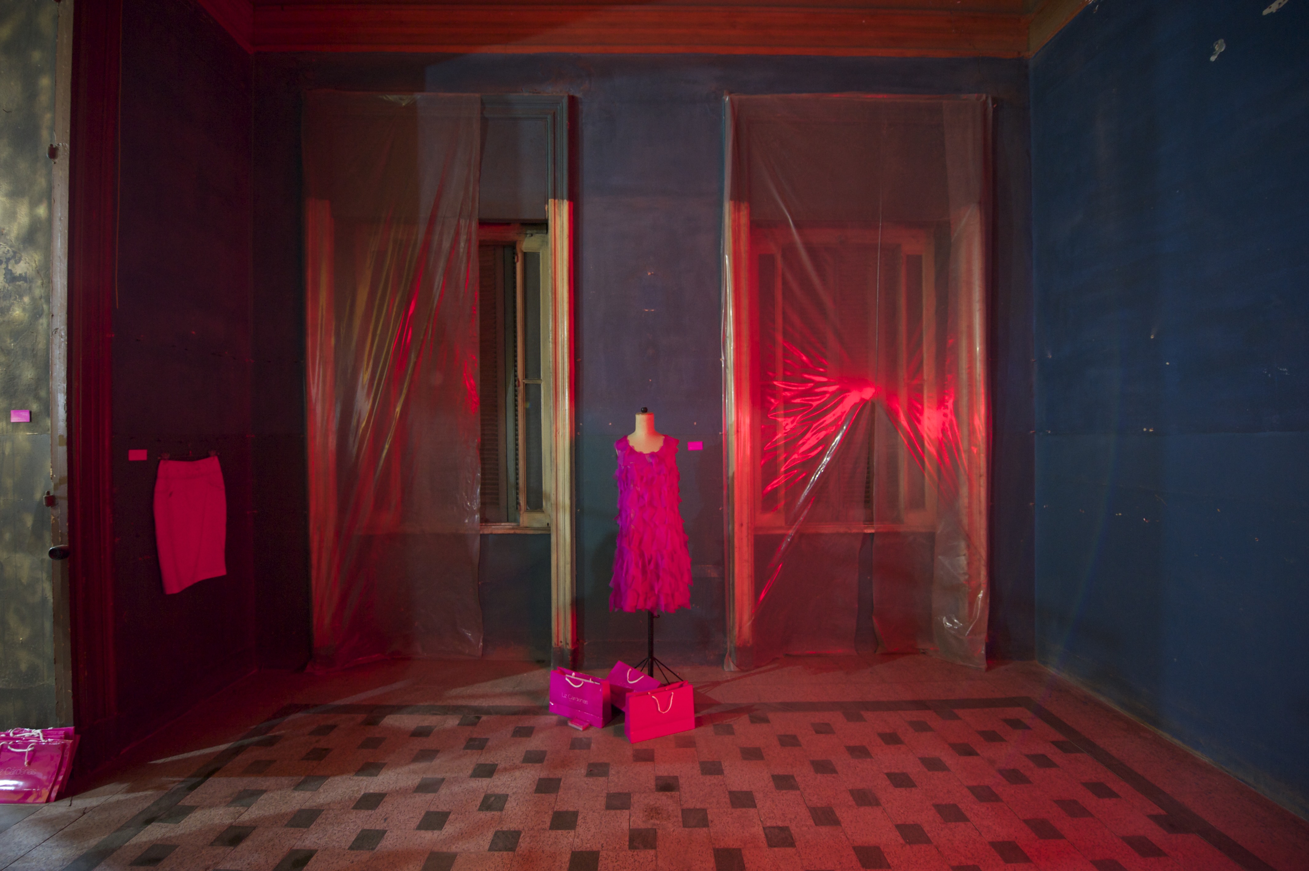 Most of the garments are made out of silk organza and chiffon in red, black and different shades of pink. Embroidery and printing have been used to depict the love theme of the collection in a subtle way. The construction and special seams allow the dresses to be used inside out. The alliance of the fashion concept and handcraft technique makes the pieces ethereal, fragile and strong at the same time. The concept of the “sacred heart of Jesus” was the central theme of the collection, perceived by the designer as an eclectic, rock’n roll icon more than a religious one. She uses the heart in many of her pieces, from well defined images of it to more abstract, simple ones. Most part of the collection was created in 2001 and it appeared in many international press, fashion books, magazines and TV in Latin America, United States and Europe. Some of the pieces were especially created for «Le Caire mon amour» Exhibition.