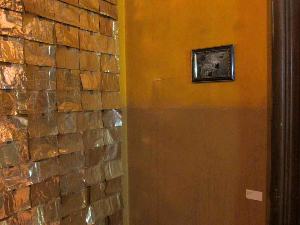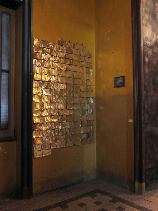 Les papiers tracent un quadrillage. Ils sont collés au mur par leur timbre estampillé « Cleopatra » ce qui leur donne un effet volatile mettant en valeur l’effet brillant de l’or.