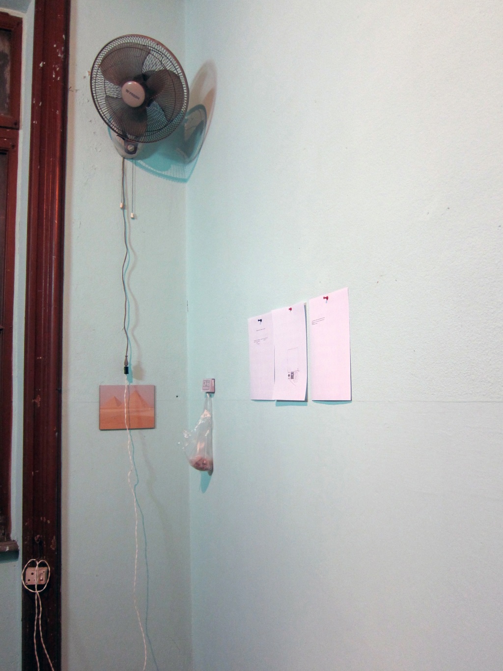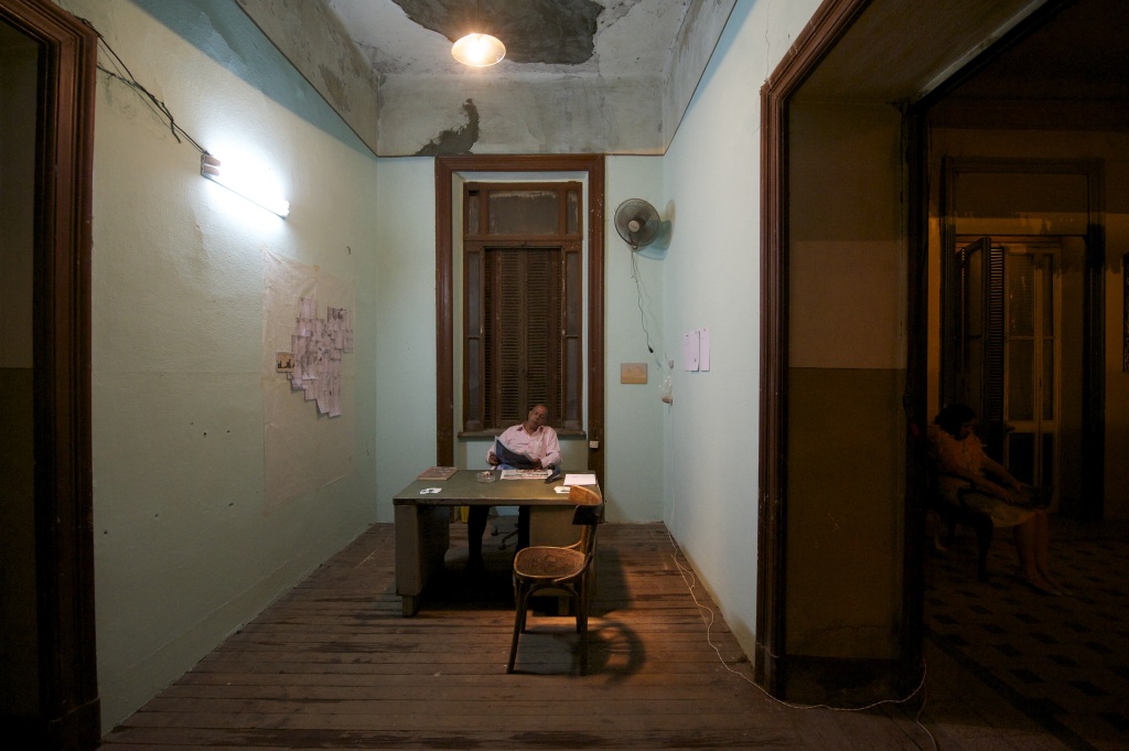 Enseigne lumineuse extérieure, bureau en métal, fauteuil en simili cuir, dispersion Aqua Dew, 2 néons blancs, chaise en bois, ventilateur, corbeille à papier en plastique, détective privé, sac en plastique, torchy, photographie des pyramides de Guizeh, calendrier mural, plan d’un quartier du Caire, dessin encadré, papier calque, loupe, cendrier, paquet de cigarettes, briquet, stylo bic, cahier administratif, tampon, cartes de visite, téléphone mobile, agrafeuse, rapports, acte de divorce censuré, procuration, 7500 feuilles A4 vierges et photographie du ministère des Affaires extérieures.