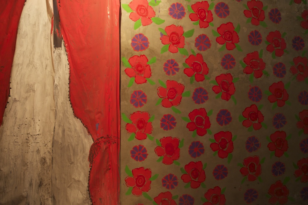 Dans le corridor de l’appartement, Anne peint une partie du mur dans le style des années 70. Sur la bâche devant la fenêtre c’est un voilage et un rideau rouge assorti aux couleurs des grosses fleurs du mur peint. Seule une partie de ce mur est peint donnant bien le sentiment d’inachevé, montrant ainsi que dans tout immobilisme rien n’est jamais fini.