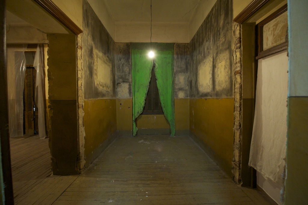 Dans l’entrée de l’appartement on peut voir sur un des murs sali par la poussière, quelques formes plus claires qui font penser à des encadrements. Ces formes vont générer l’idée d’un premier salon : « le rideau vert ».