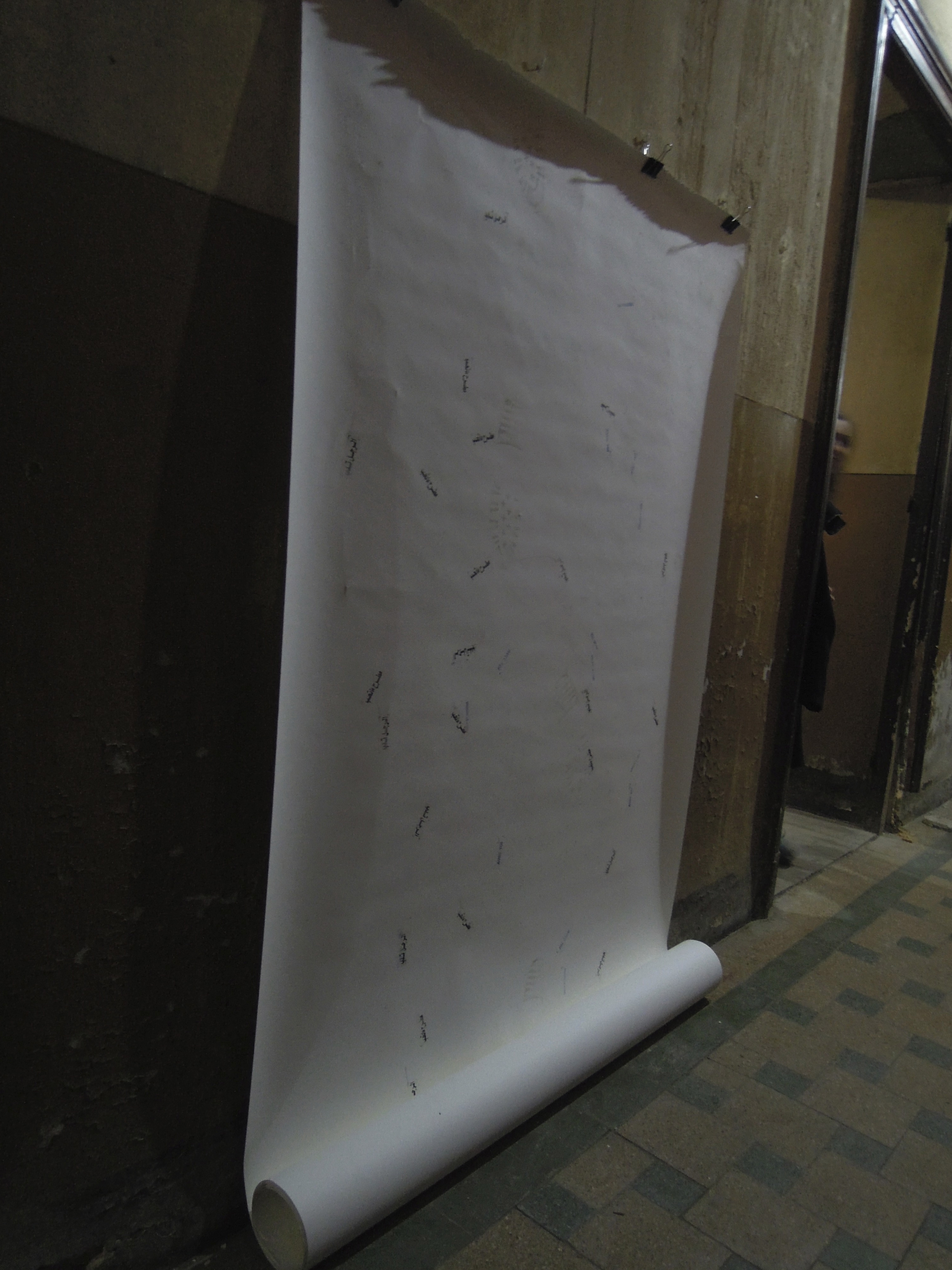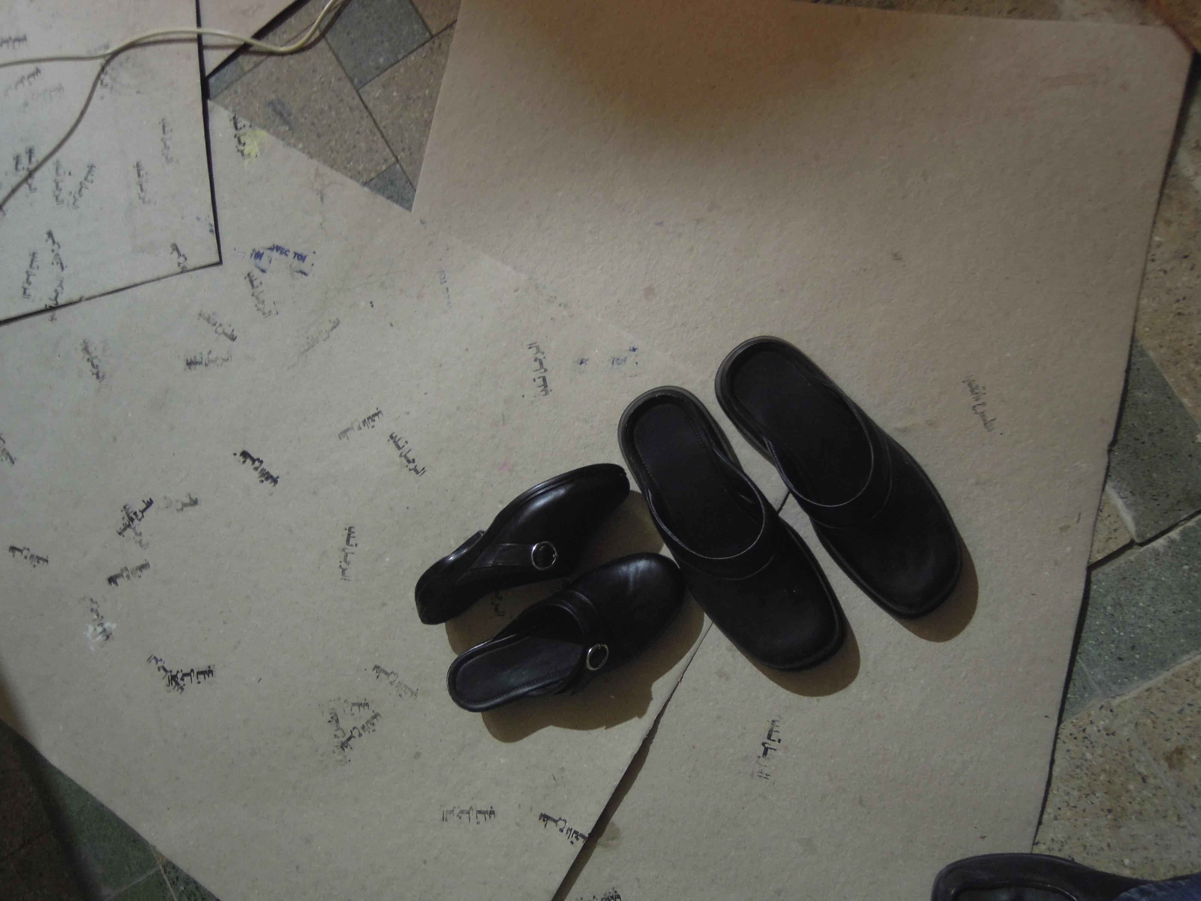 Autre pièce à témoigner de l’intention d’entrer et sortir du lieu d’exposition ce sont les tampons qui écrivent des mots à chaque pas. Prenant la suite des tampons yalla/fen (on y va, mais où ?), cette fois les chaussures portées par un Egyptien marquent en arabe libre d’aller/où me mènent mes pas et celles portées par l’artiste répètent perdre le Nord/avec toi. La déambulation côte à côte inscrivait ainsi ces mots sur le sol à chaque pas.