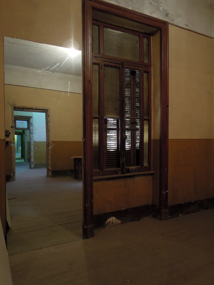 Comme dans un tableau de Vermeer, la perspective des pièces en enfilade se reflète à l’infini dans le miroir. Les dimensions du miroir sont identiques aux chambranles de portes.