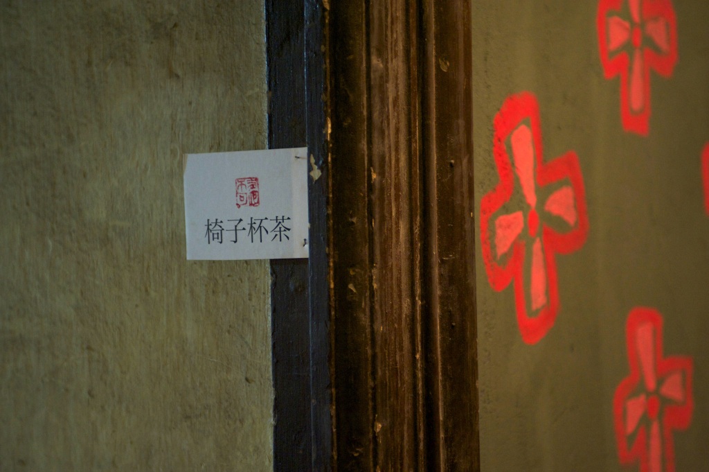 Chaise trouée, planche, verre de thé, sucrier, petite cuillère, plateau en métal.